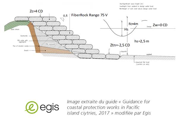 Cet outil permet une étude des points critiques de la stabilité d’un ouvrage : les géoconteneurs de crête (sollicités en cas de submersion), les géoconteneurs dans la zone du niveau d’eau au repos (sollicités par les vagues), et les géoconteneurs de pied (sensibles à l’affouillement).